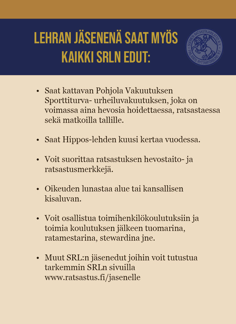 Voit liittyä lehran jäseneksi helposti SRL:n sivuilla. Mene osoitteeseen liity.ratsastus.fi ja täytä jäsenlomake. Valitse seuraksi Lehtimäen Ratsastajat
